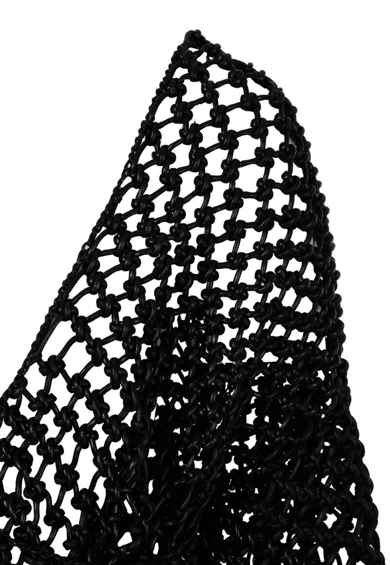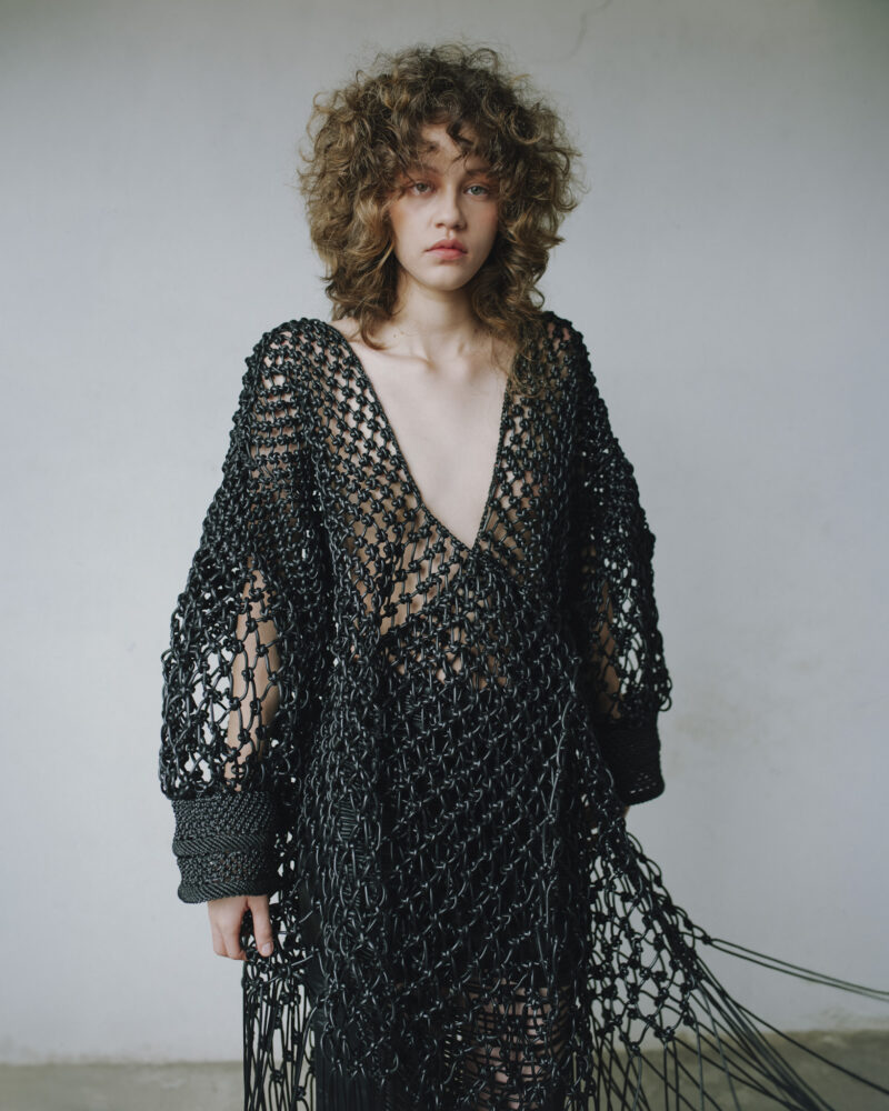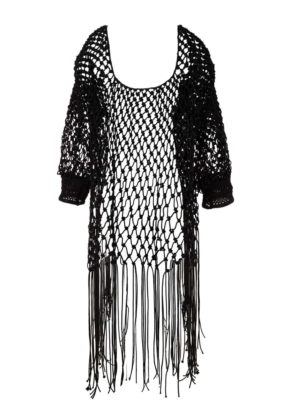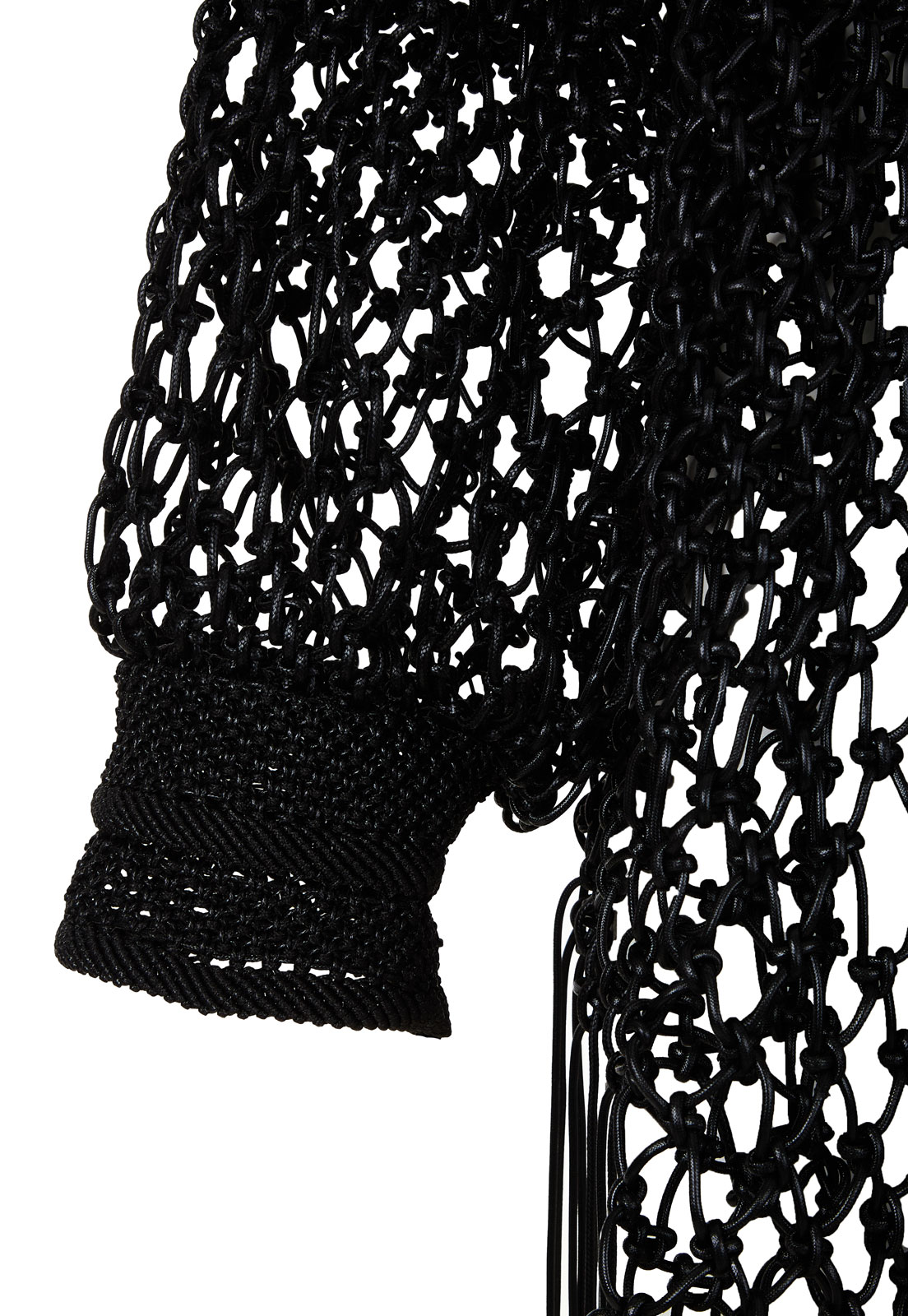 Camisa tejida completamente a mano con nudos de macramé, y cerrada a mano puntada por puntada. De silueta amplia y mangas voluminosas que terminan en puños también tejidos en macramé. Flecos largos caen desde el ruedo hasta el suelo, aportando dramatismo y movimiento.