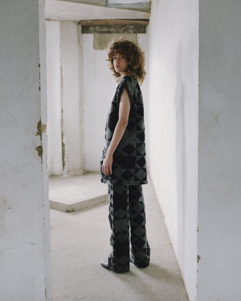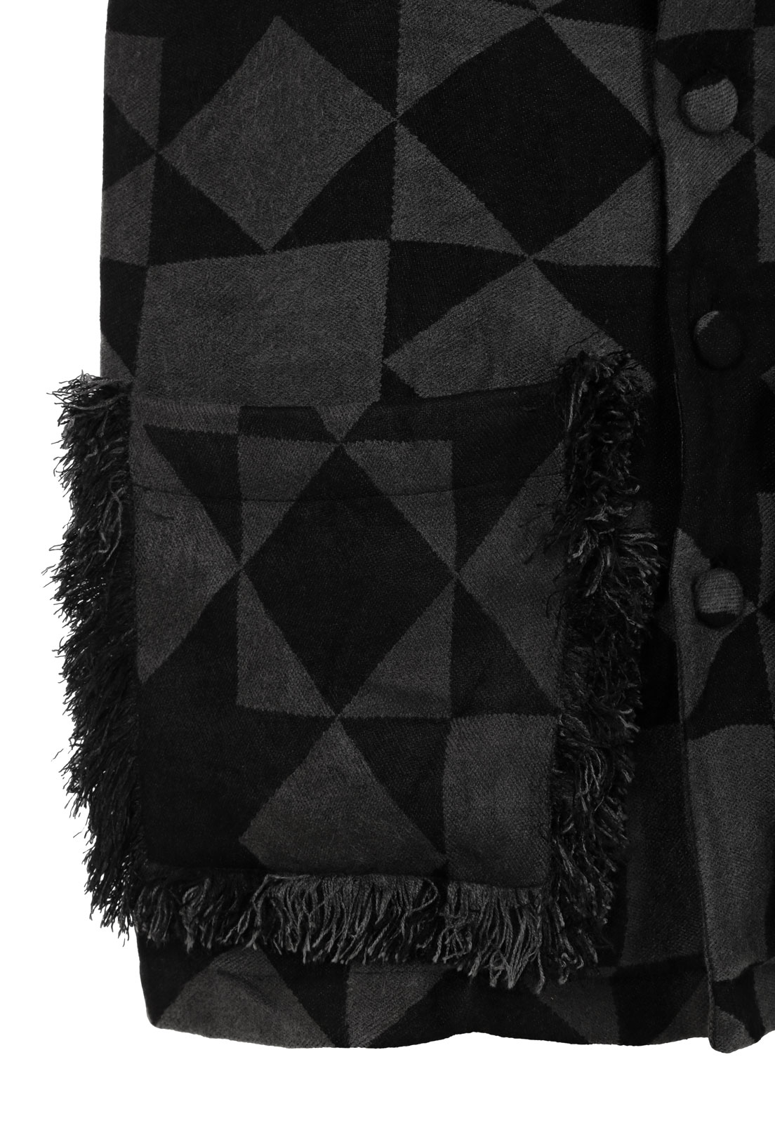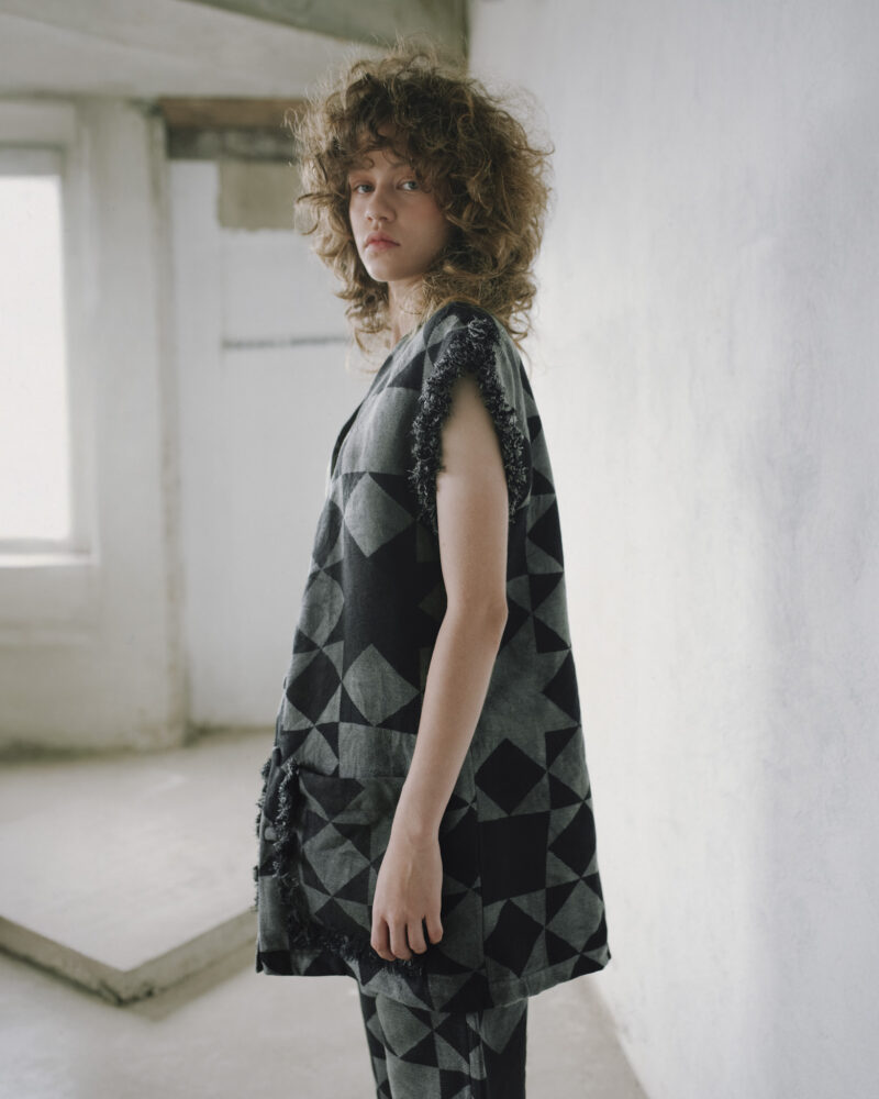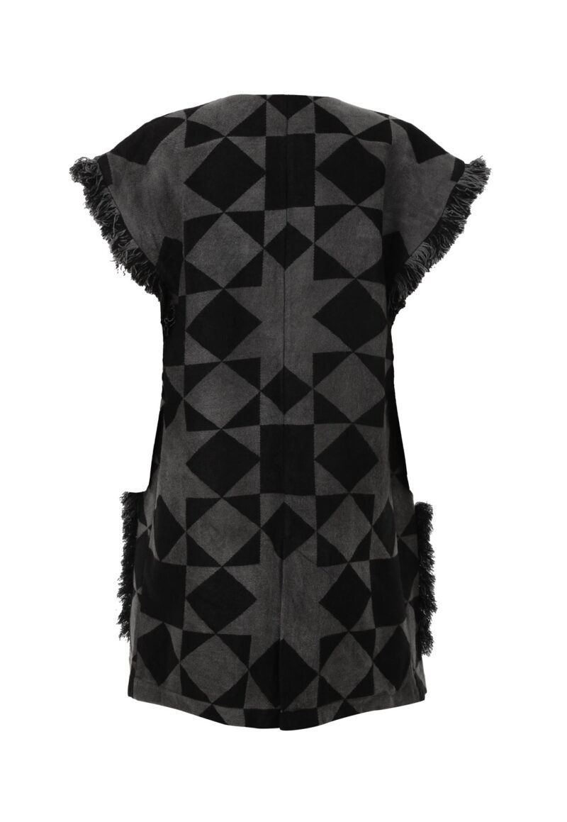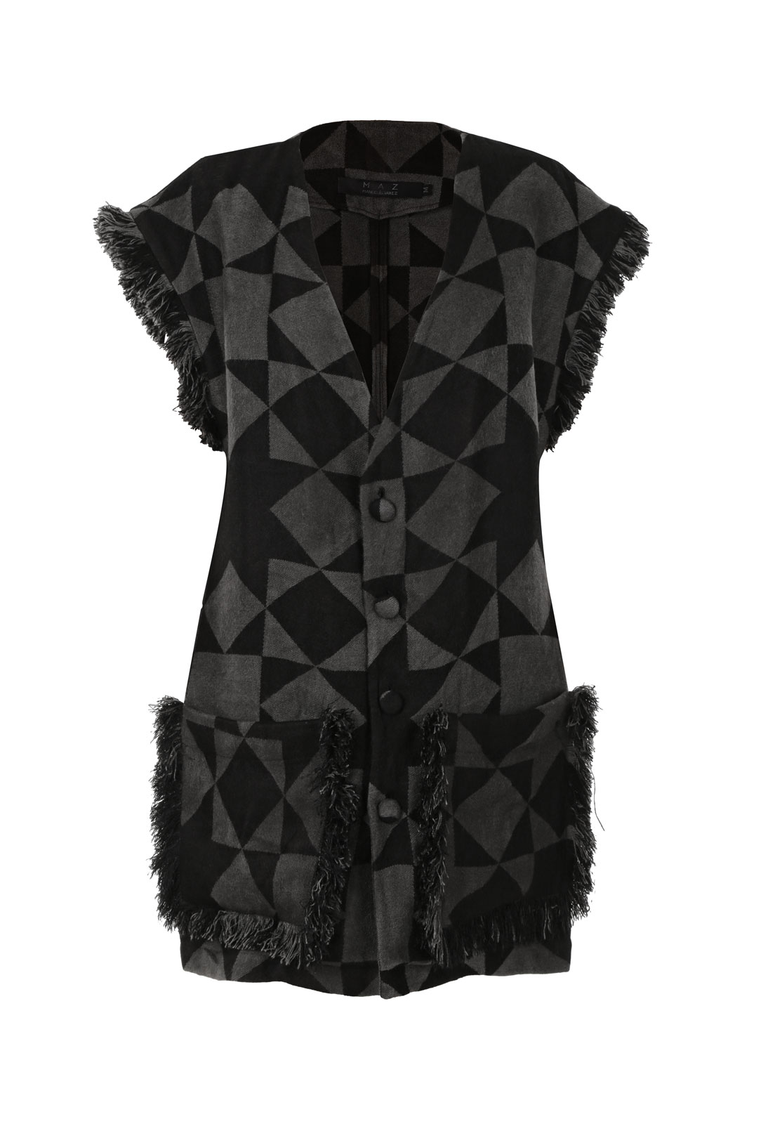 Chaleco con el patrón característico de la colección Alma Feral. De silueta recta y amplia, con flecos en los hombros y bolsillos, elaborados en el mismo telar. Cierra con botones forrados en tejido de telar.