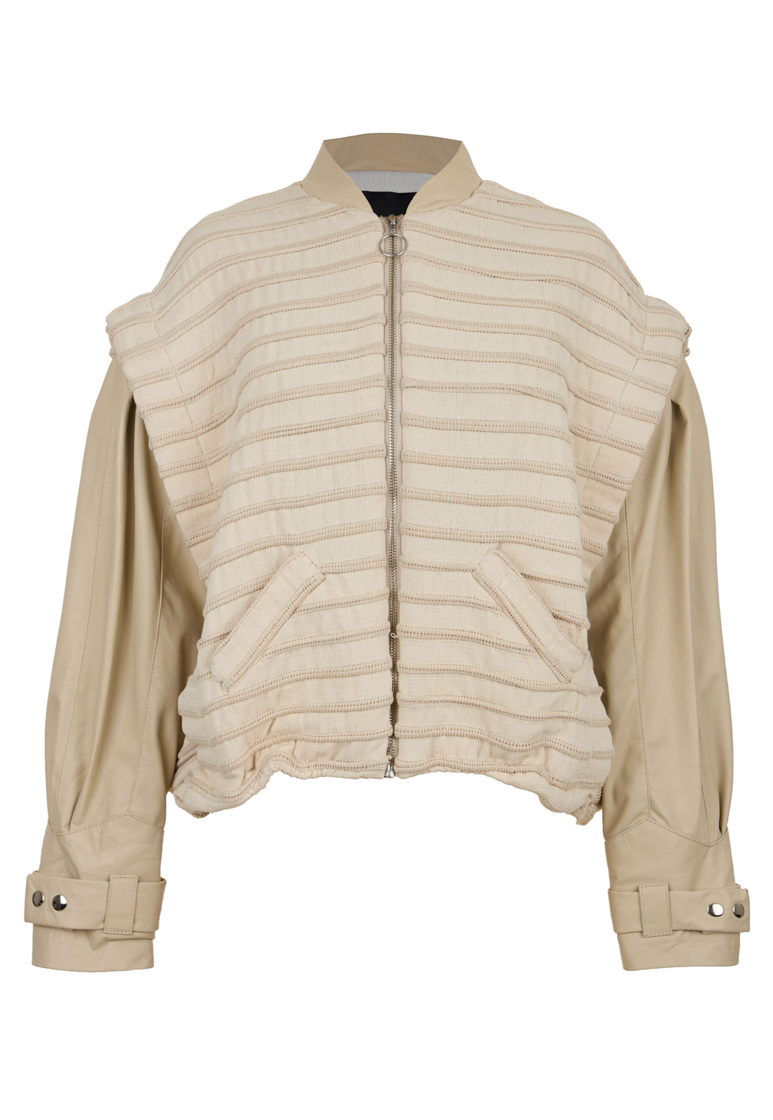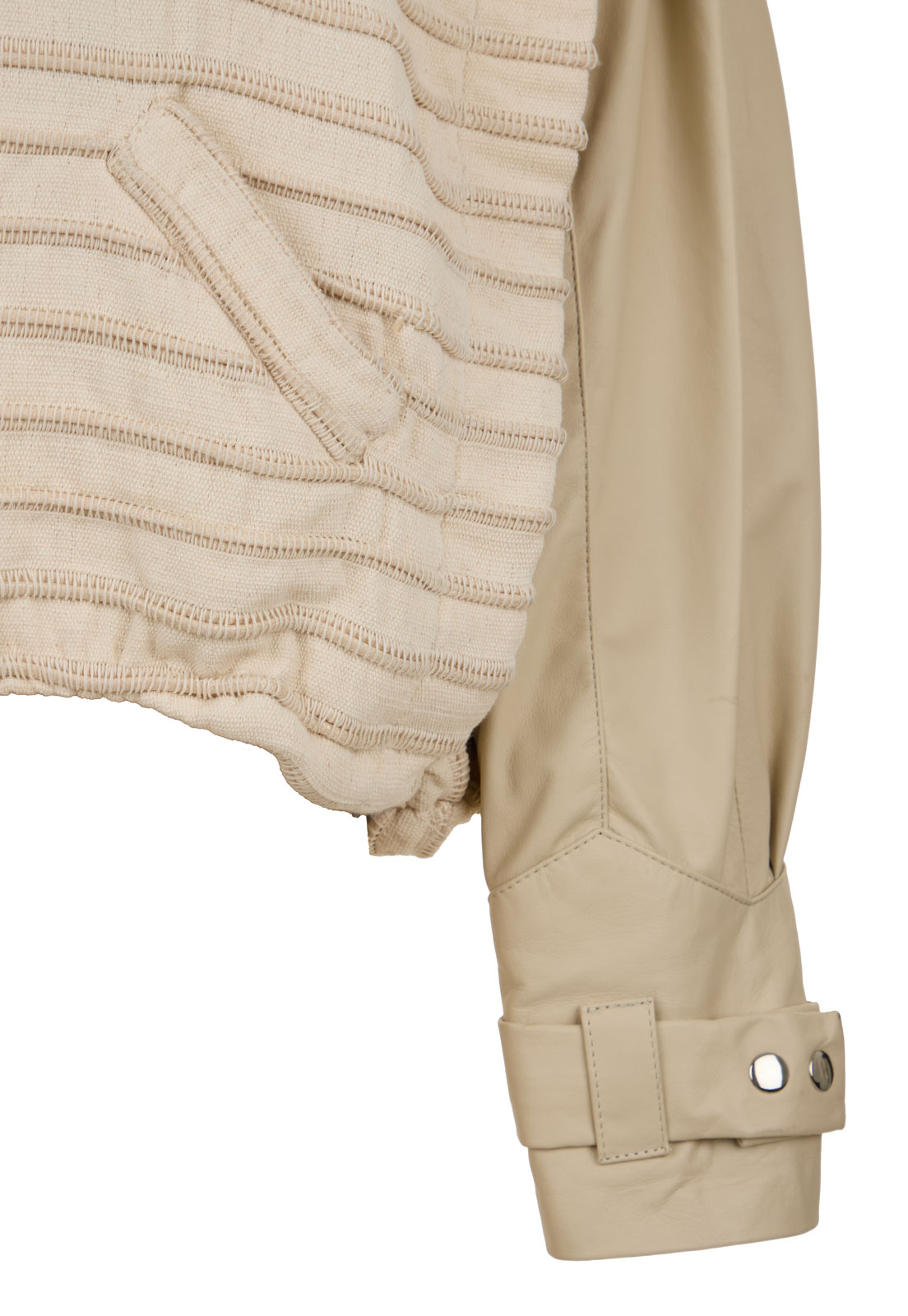 Una silueta clásica, genderless y cosmopolita de la chaqueta bomber reinterpretada en el laboratorio textil de MAZ. Sus mangas y el cuello en cuero colombiano contrastan con la textura artesanal de la trama “Víbora”, un textil innovador de la temporada tejido 100% a mano en un telar horizontal con algodón y cordón de cuero, que simula el movimiento de una serpiente. Su combinación de texturas crean una prenda que conecta la fuerza y la sensibilidad.