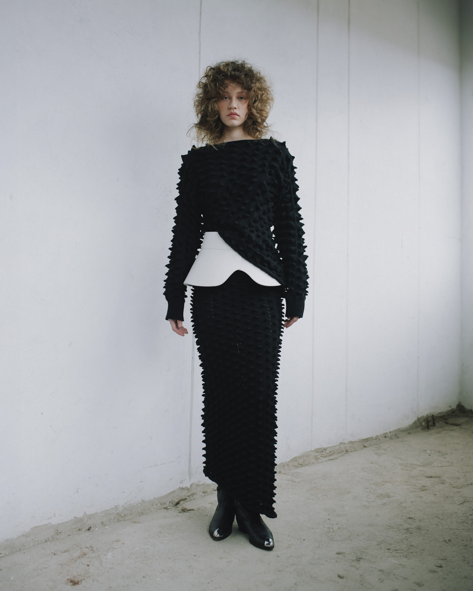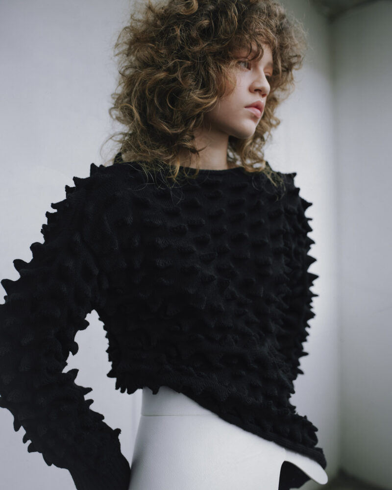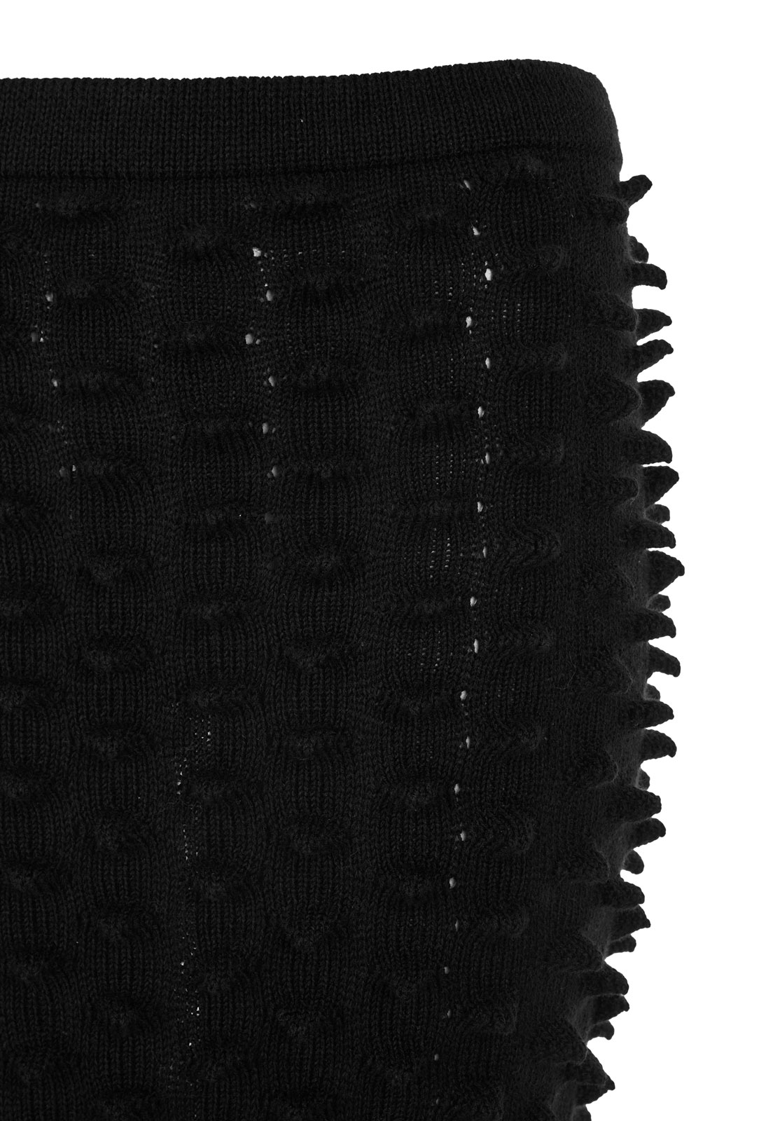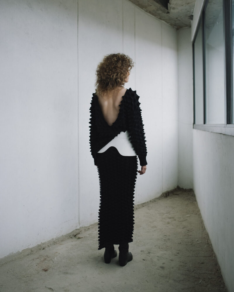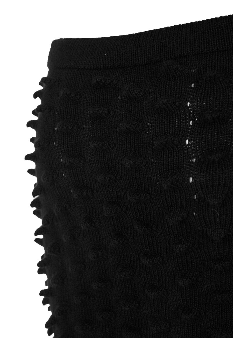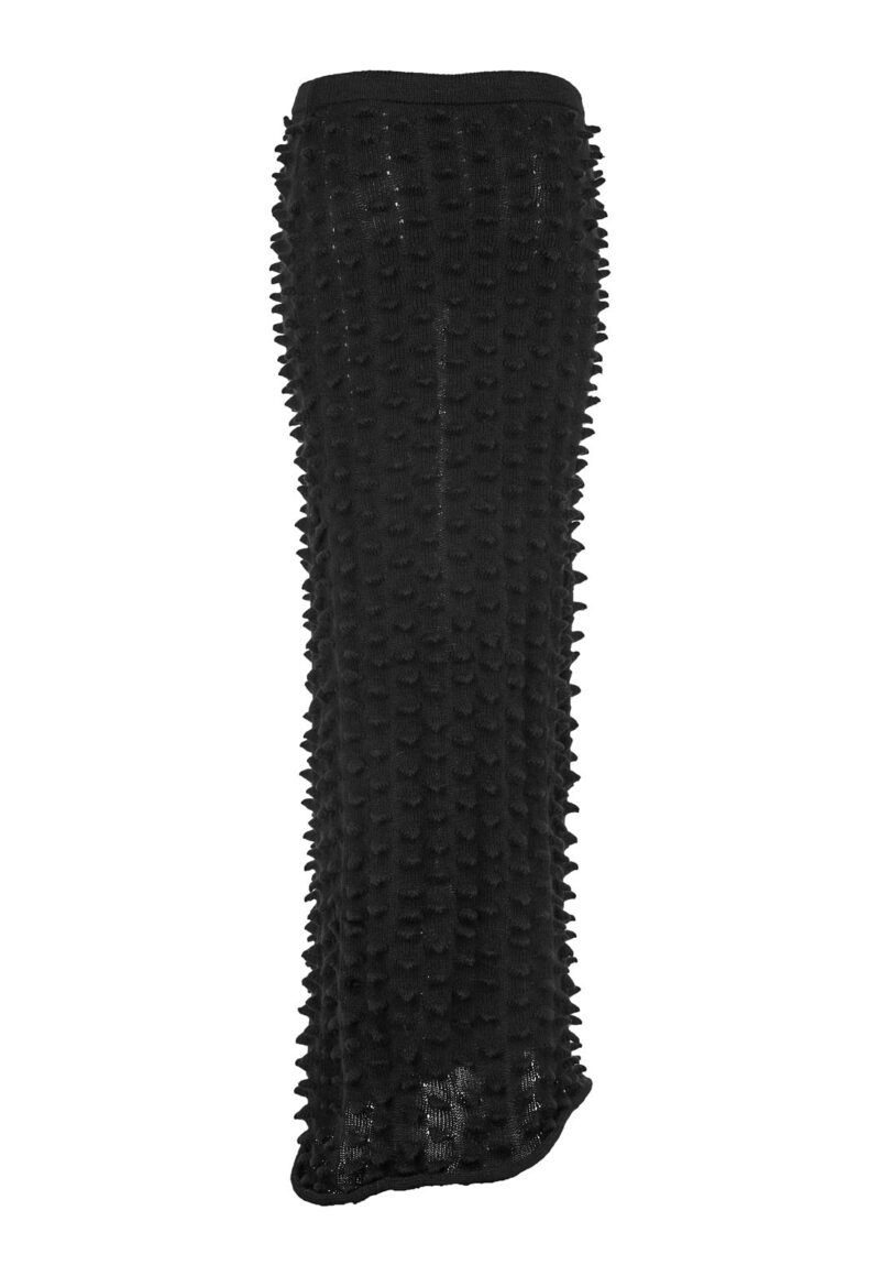 Falda larga hasta los tobillos, confeccionada en la técnica de innovación de la temporada: picos estructurales tejidos en tejido de punto en máquina manual. Presenta una silueta tubo con descarga lateral izquierda.