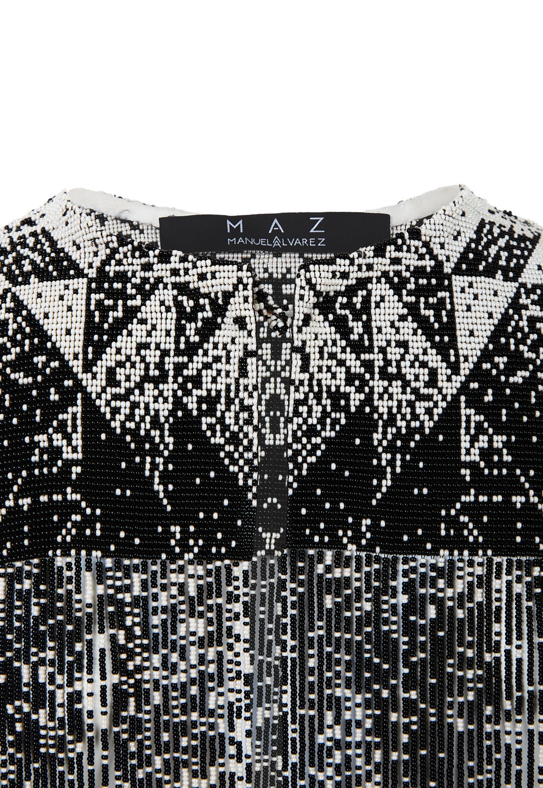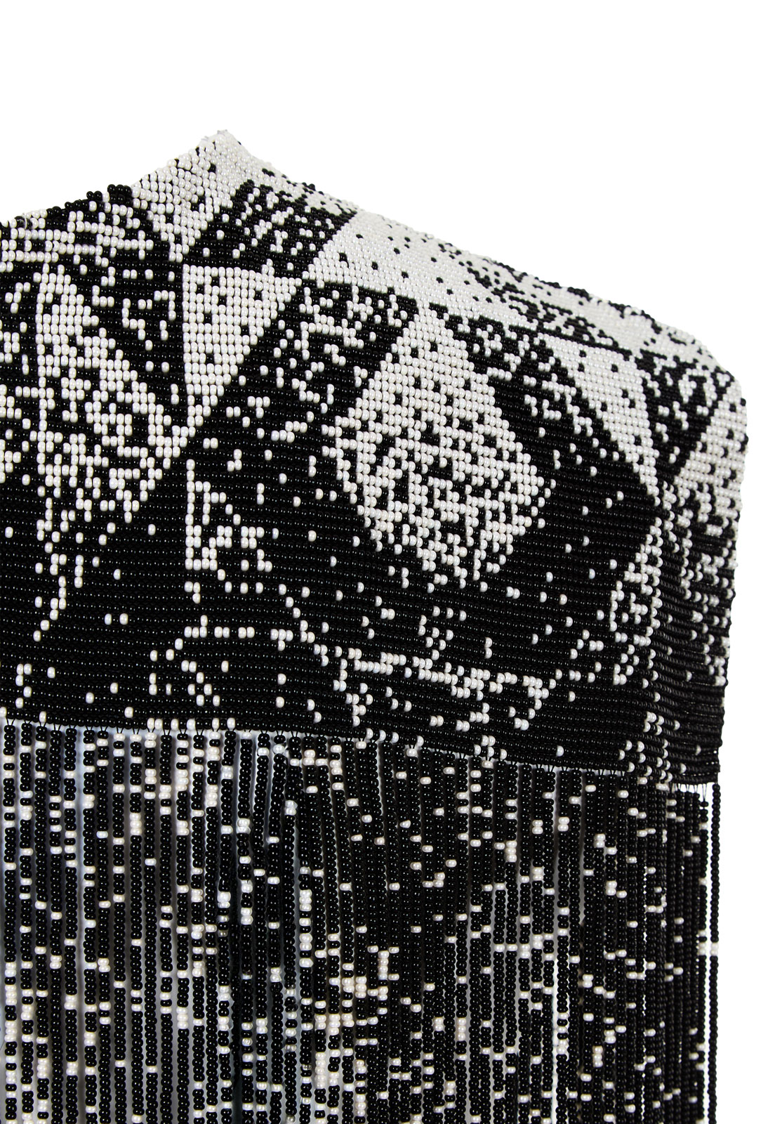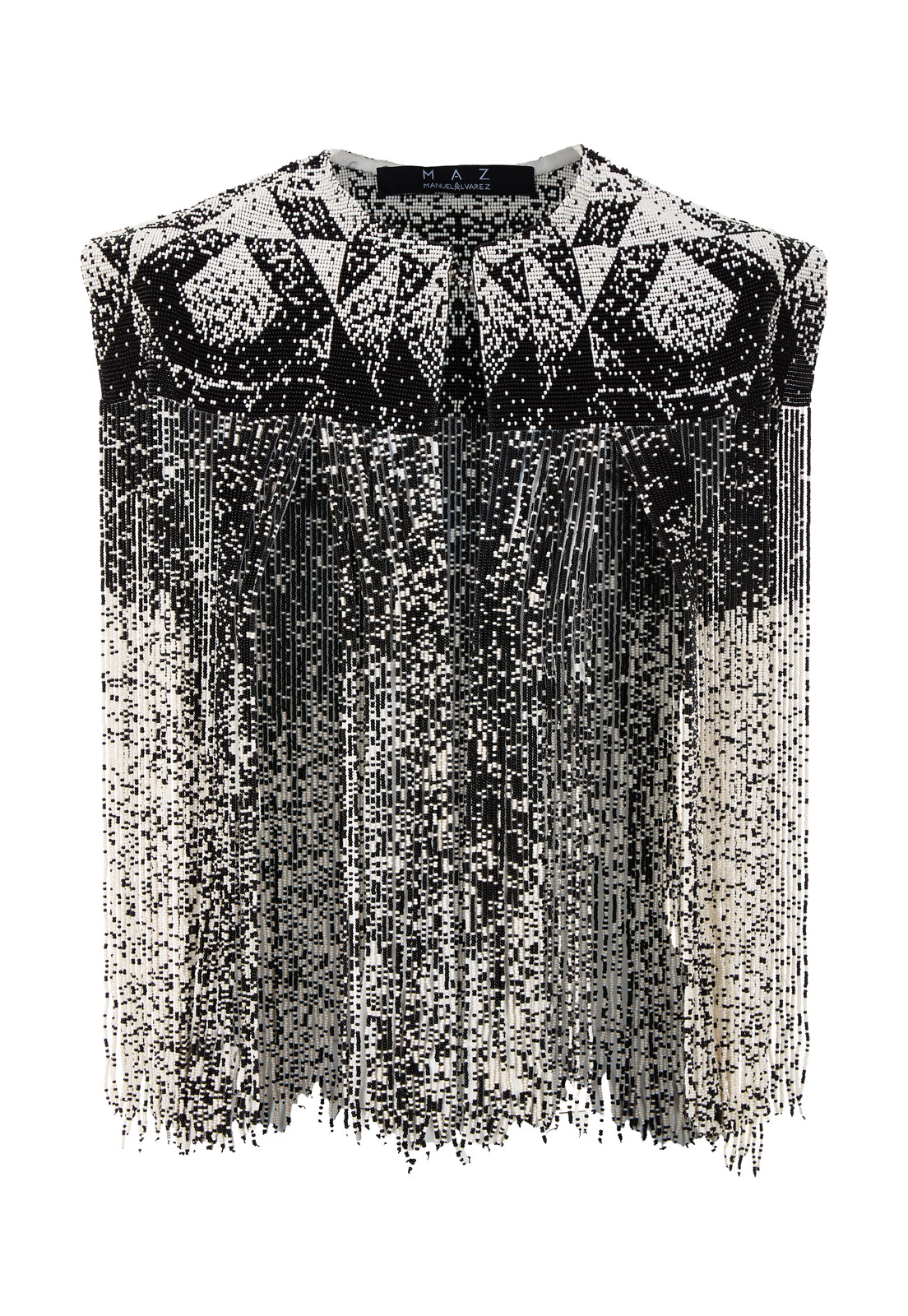 Hombreras tejidas en chaquiras con flecos que caen hasta la cadera. Tejido en el patrón característico de la colección Alma Feral, en tonos matizados de crudo y negro.