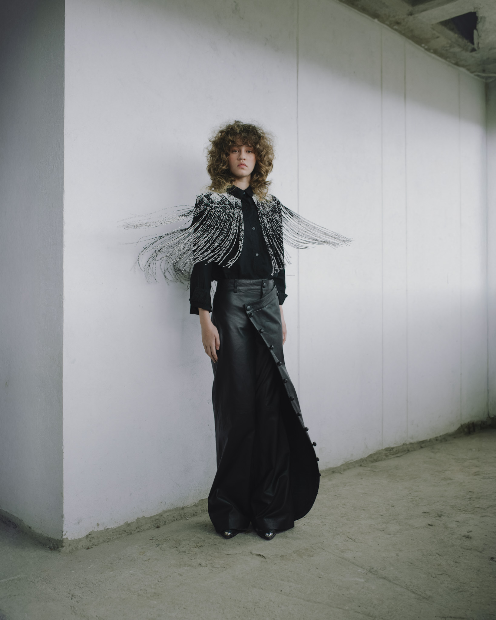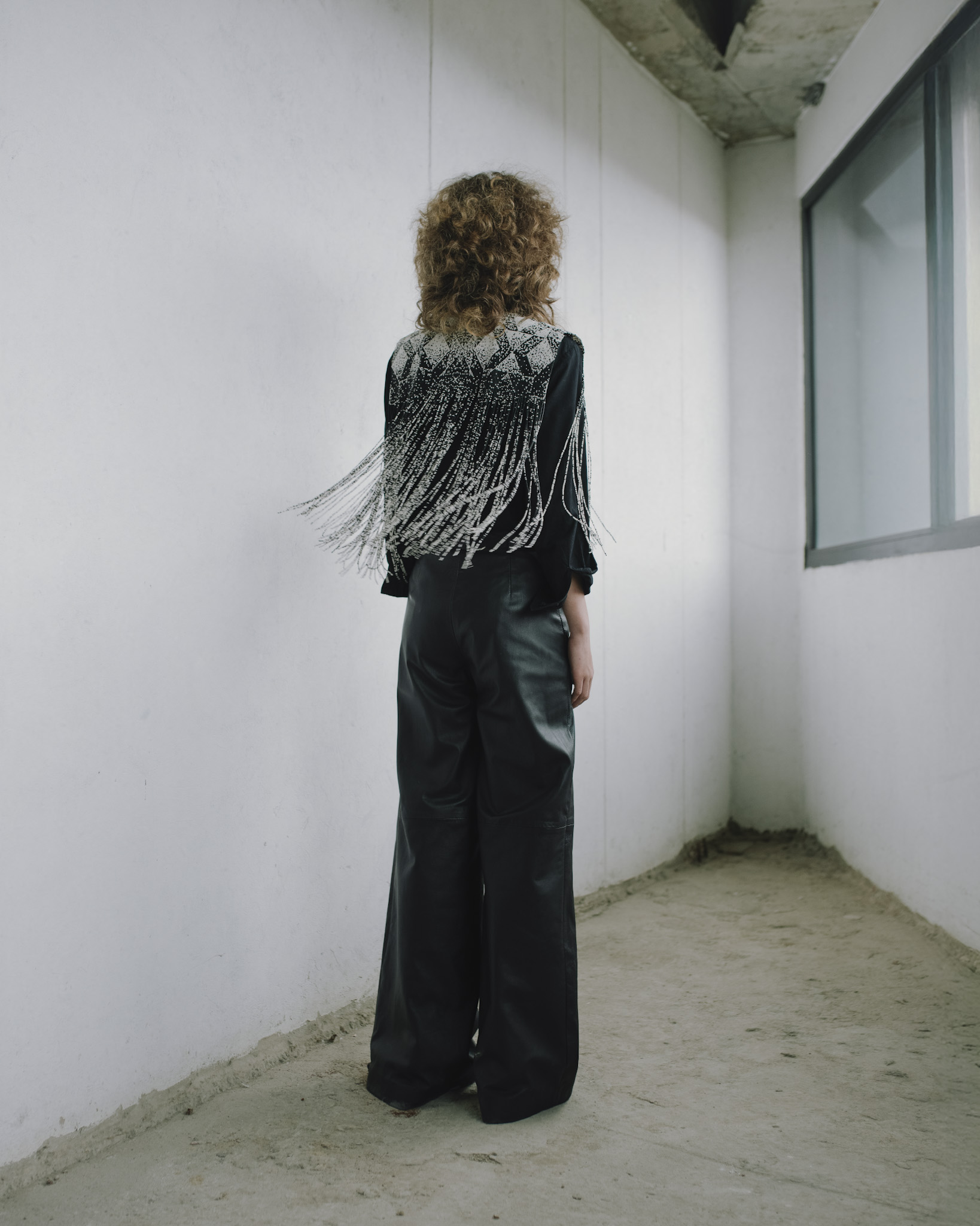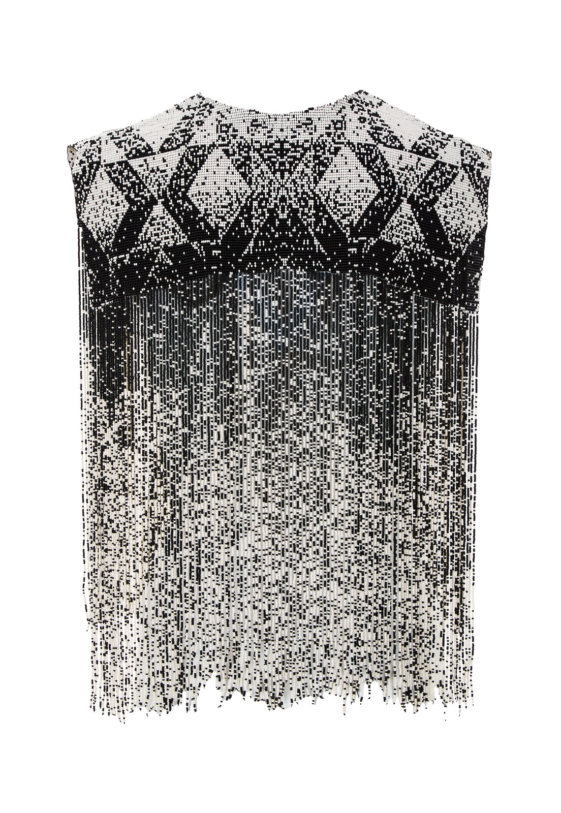 Hombreras tejidas en chaquiras con flecos que caen hasta la cadera. Tejido en el patrón característico de la colección Alma Feral, en tonos matizados de crudo y negro.