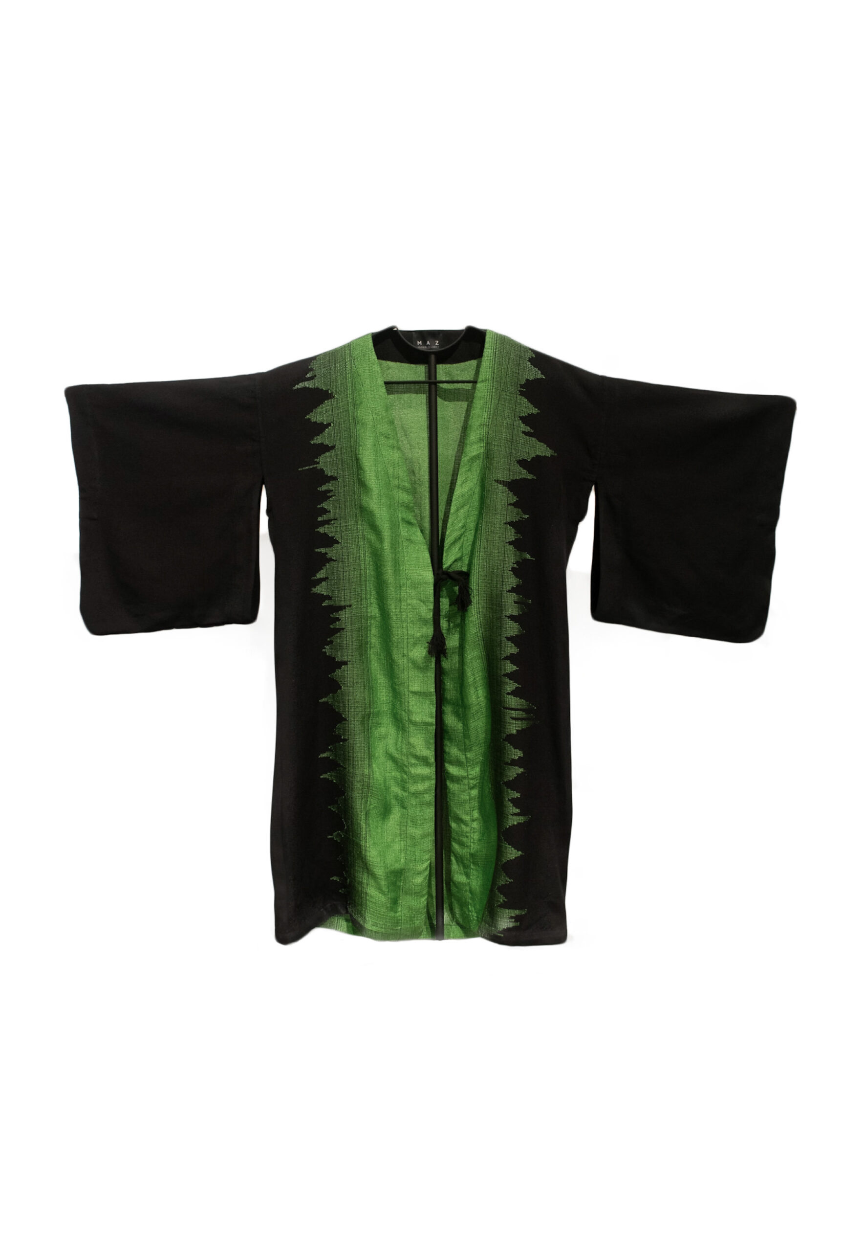 El kimono está confeccionado en tafetán negro de estructura ligera e incorpora un panel central continuo de tejido de Chumbe elaborado en telar horizontal en un tono verde matcha, que recorre el centro delantero y centro espalda como eje visual de la prenda. Su silueta se inspira en el kimono tradicional japonés, con mangas amplias y rectas, un largo midi–largo que cae entre la rodilla y el tobillo, y un cierre frontal mediante amarre, manteniendo una lectura depurada y contemporánea.