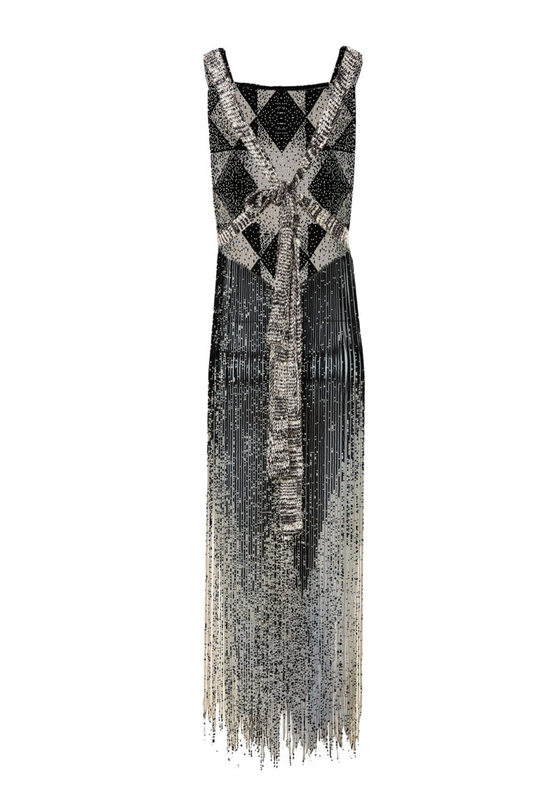 Pechera elaborada en tejido de chaquiras, con flecos dispuestos en forma de “v” que caen hasta la altura de la rodilla. Una pieza de alto detalle que aporta dramatismo y sofisticación a cualquier look.