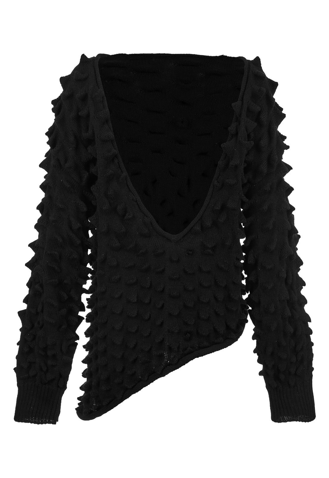 Saco de silueta oversized con descarga lateral izquierda, tejido en la técnica de innovación de la temporada: picos estructurales realizados en tejido de punto en máquina manual. Su construcción reversible permite usarlo tanto con su escote en V profundo hacia el frente como hacia la espalda.