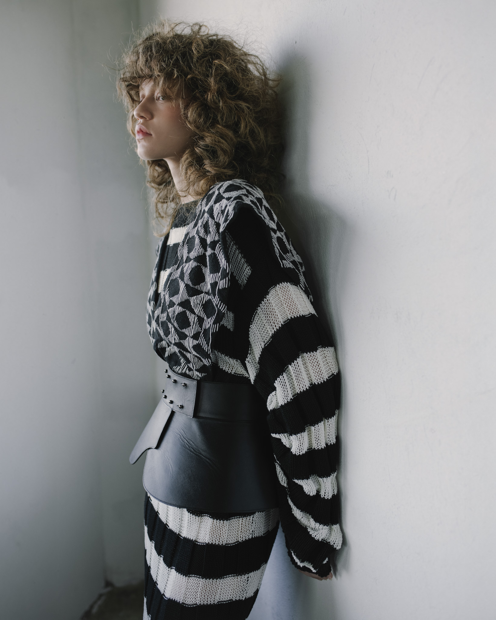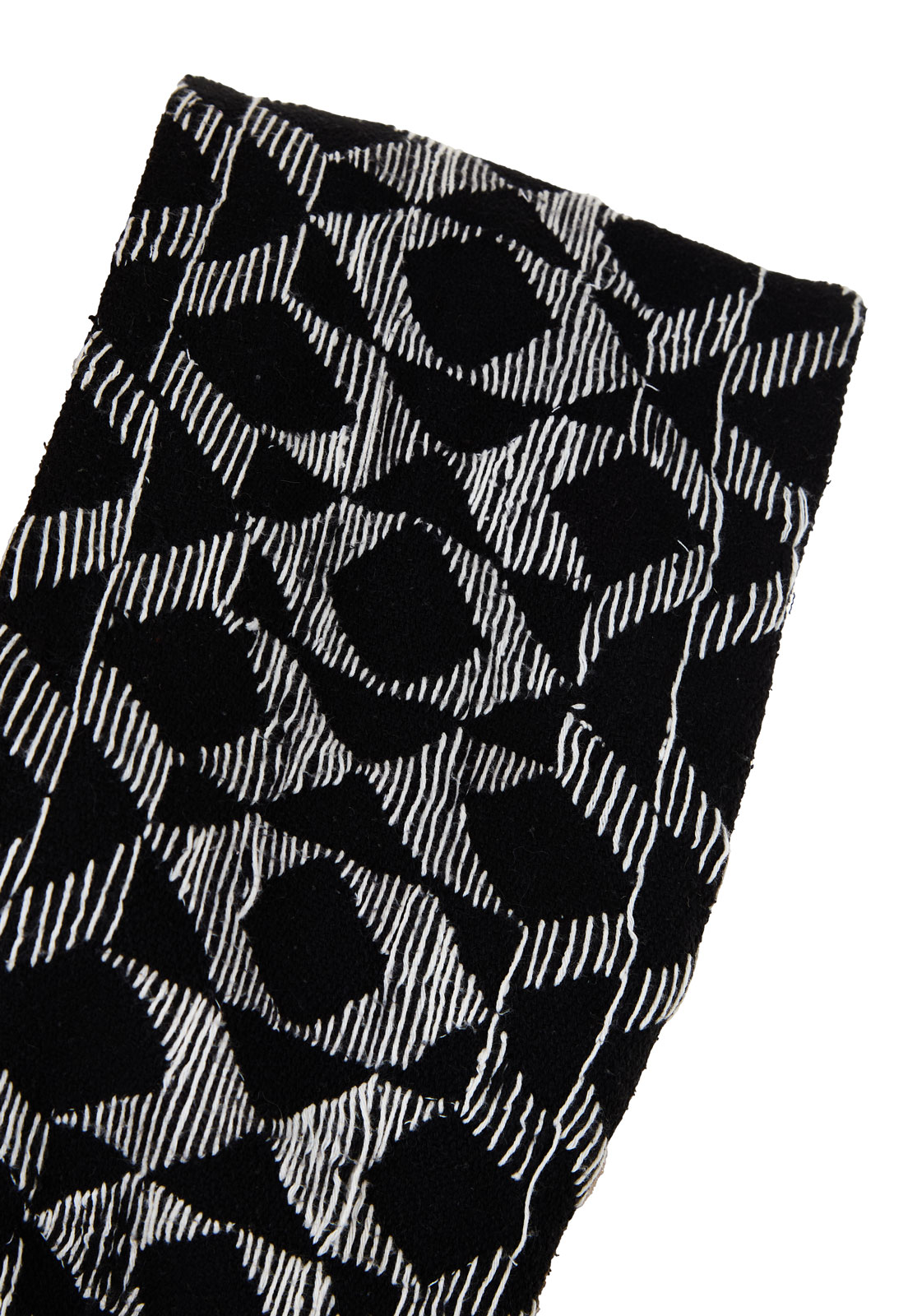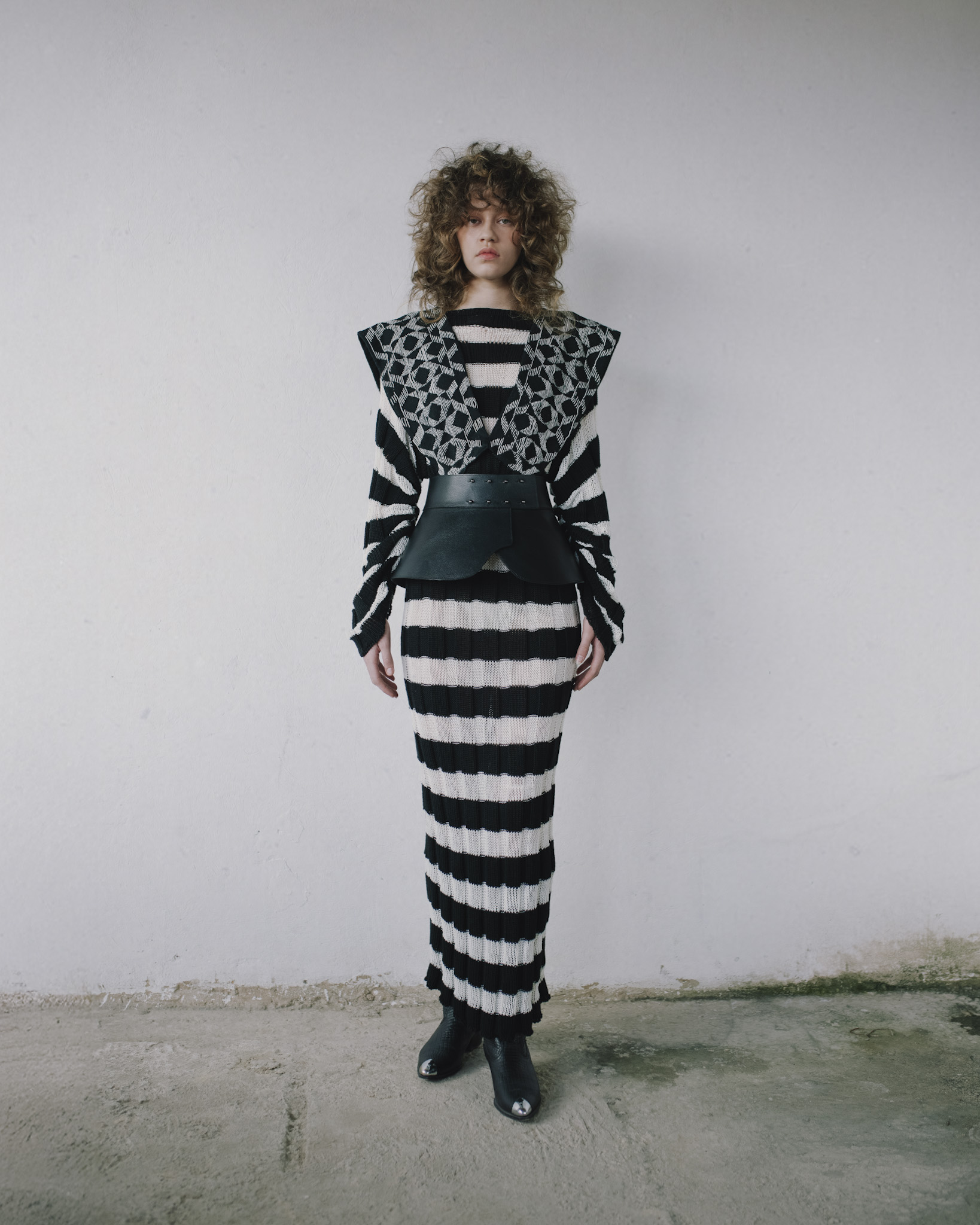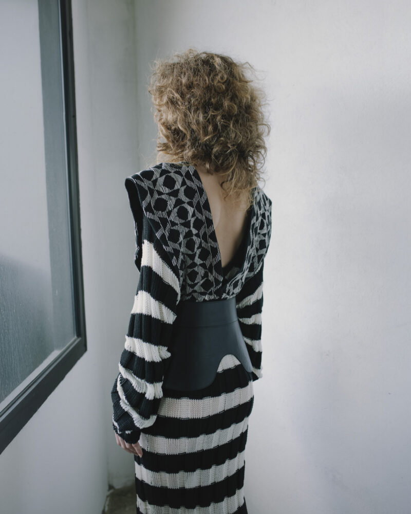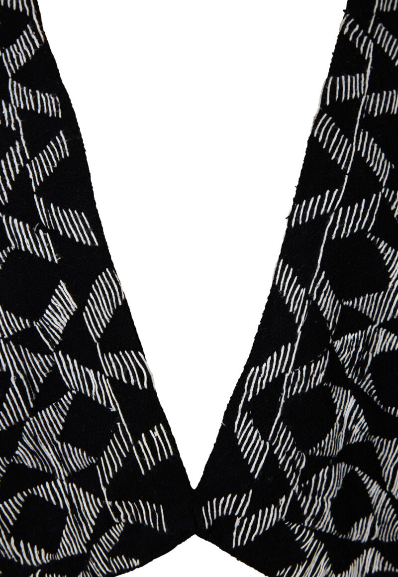 Top elaborado en algodón negro tejido a mano en telar horizontal. Sobre esta base se borda manualmente, en hilos de algodón crudo y negro, el patrón característico de la colección Alma Feral. Con escote en “v” en el frente y la espalda, y un largo que llega hasta la cintura.