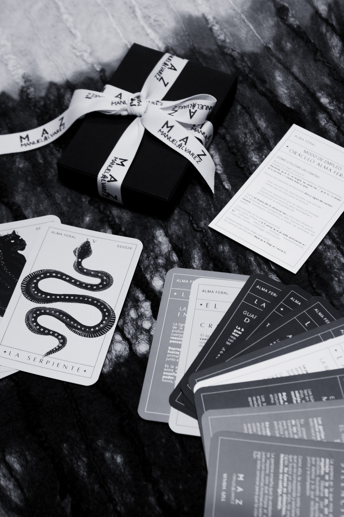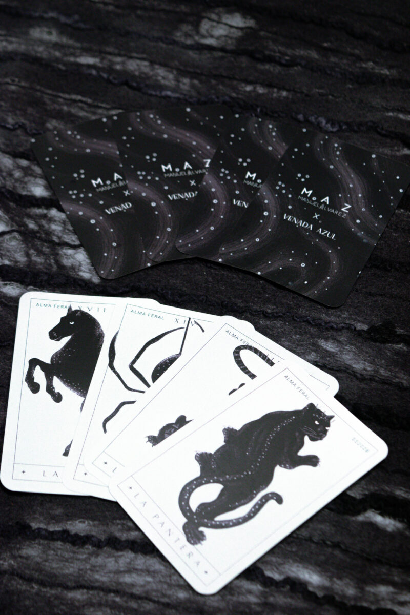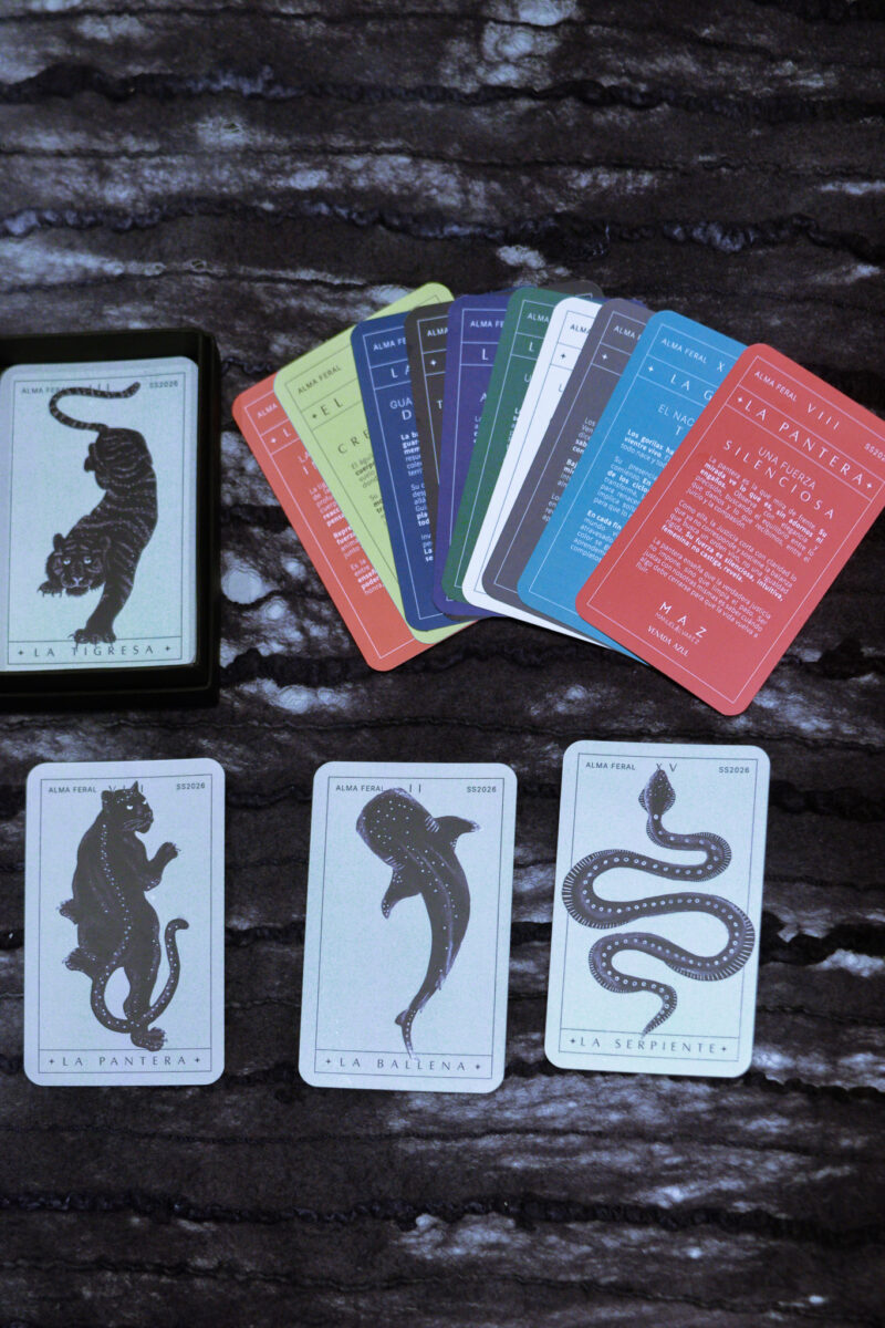 The Alma Feral Oracle brings together the power animals that accompanied the creation of the collection—each one embodying a distinct energy and a feminine archetype that reveals and activates inner strength. Co-created with Nicole Antoine-Feill Baron (@venadazul) and hand-illustrated and designed by Valentina Muñoz, this oracle serves as a guide for transitions, new beginnings, and processes of transformation: a mirror to remember the power that already lives within you.