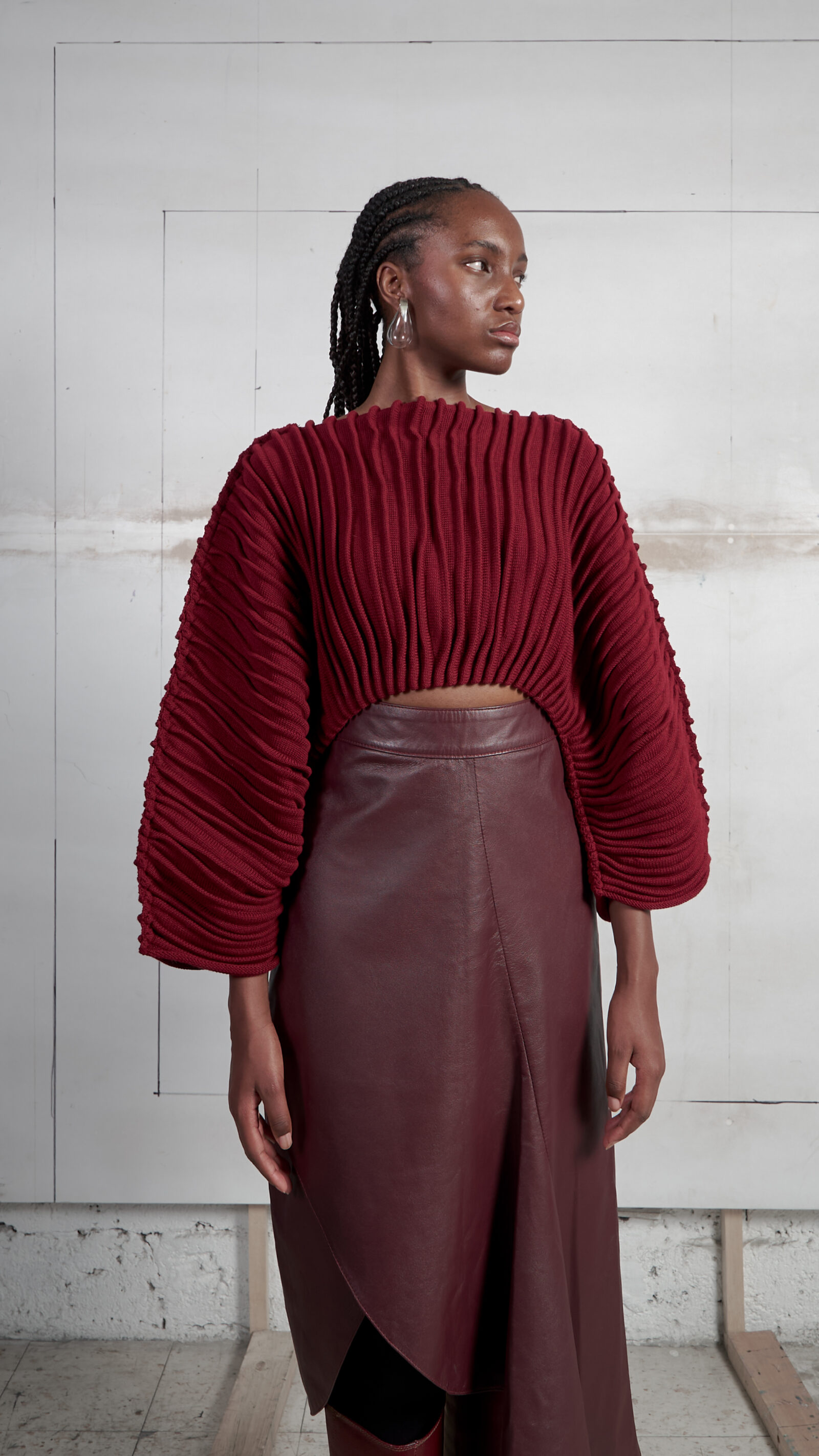 Skirt made of 100% Colombian leather, asymmetric, with a cut in the leg that lengthens the silhouette.